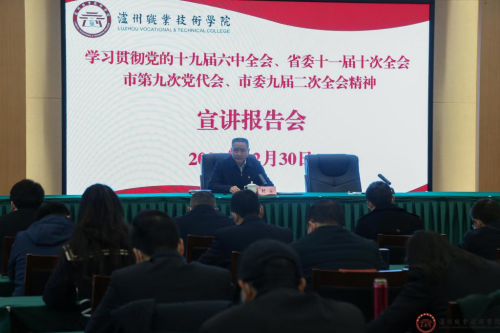 按照中央、省委、市委的部署要求,12月30日市委副书记封安来到泸州职业技术学院,对党的十九届六中全会精神、省委十一届十次全会精神、市第九次党代会精神、市委九届二次全会精神进行宣讲。校党委书记何杰主持宣讲报告会,学校中层以上干部、人大代表、政协委员和学生代表聆听报告。